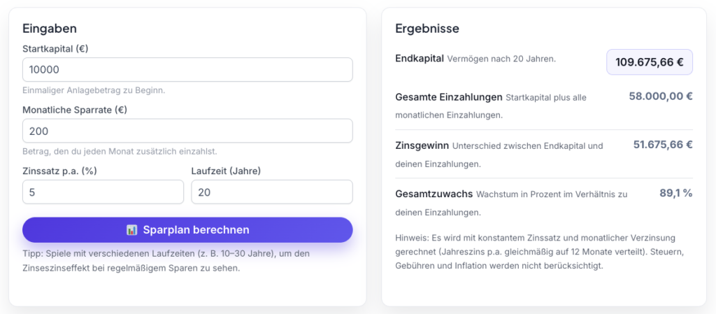 Der Zinsrechner regelmäßig zeigt dir, wie sich dein Vermögen durch regelmäßiges Sparen aufbaut.