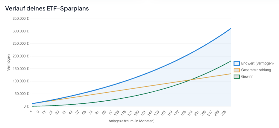 Unser neuer ETF Sparplan Rechner ist ab sofort verfügbar! Gib Startkapital, monatliche Sparrate, Rendite und Gebühren ein – und erhalte sofort den Endwert deines Vermögens, die Gesamteinzahlung, deinen realen Gewinn sowie die gesamten Gebühren über den gesamten Anlagezeitraum. Zusätzlich zeigt dir der Rechner eine detaillierte Monatstabelle, eine klare Vermögenskurve sowie den Verlauf von Einzahlungen, Endwert und Gewinn.