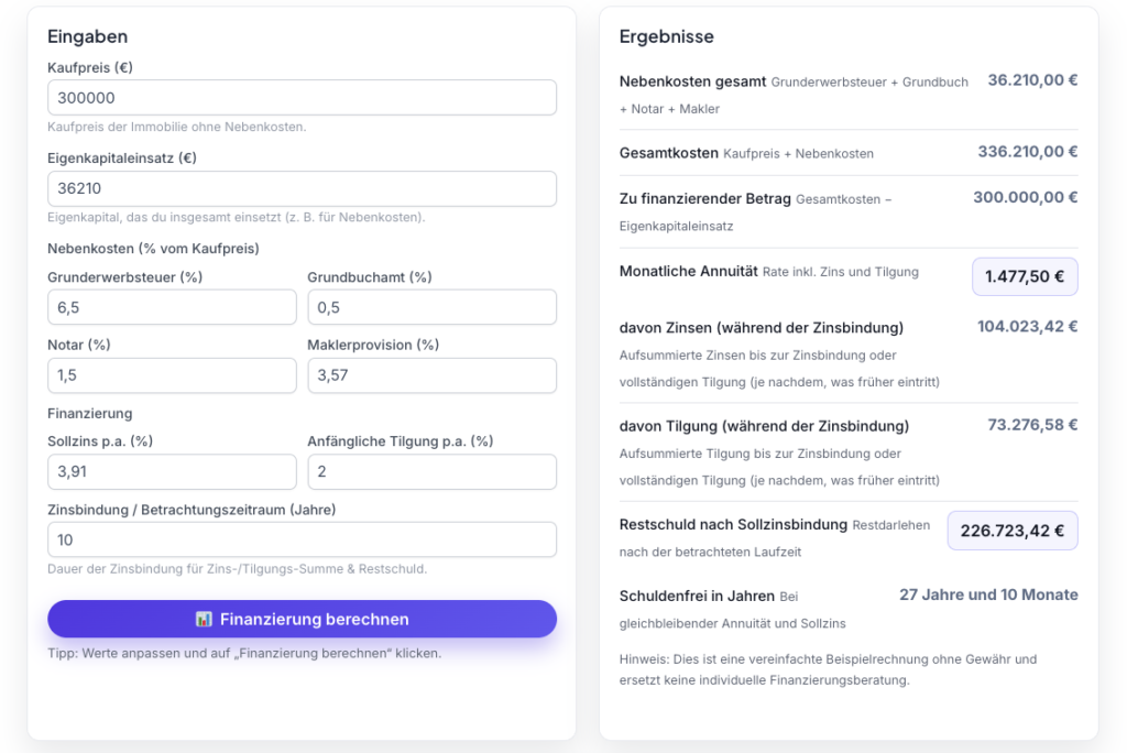 Auf dieser Plattform findest du präzise Immobilien- und Finanzrechner: vom Finanzierungsrechner über den Renditerechner bis zum Budget- und Zinsrechner. Einfach eingeben, berechnen und bessere Entscheidungen treffen!